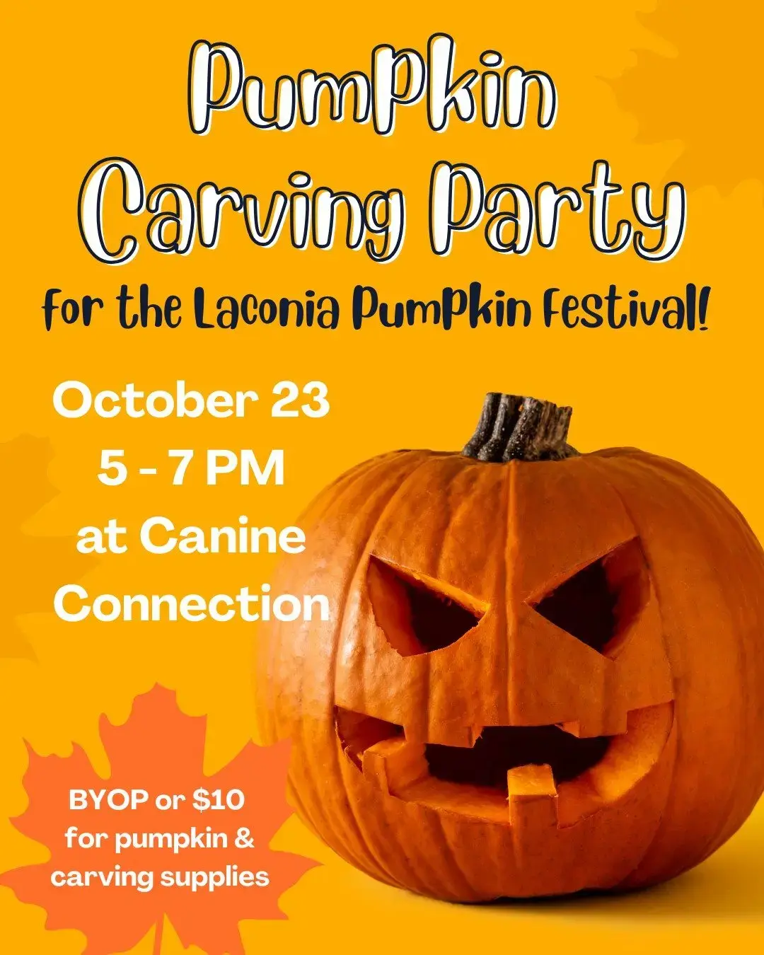 Join them for a Pumpkin Carving Party to support the Laconia Pumpkin Festival! They need 900 pumpkins to fill their tower, and local businesses are supporting the effort.